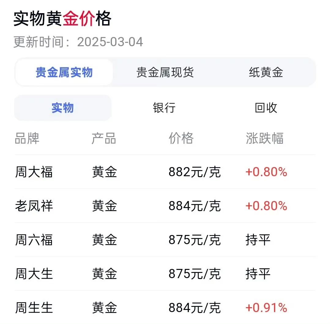 相比之下,周大福、周生生等品牌线下金价已超过880元/克。