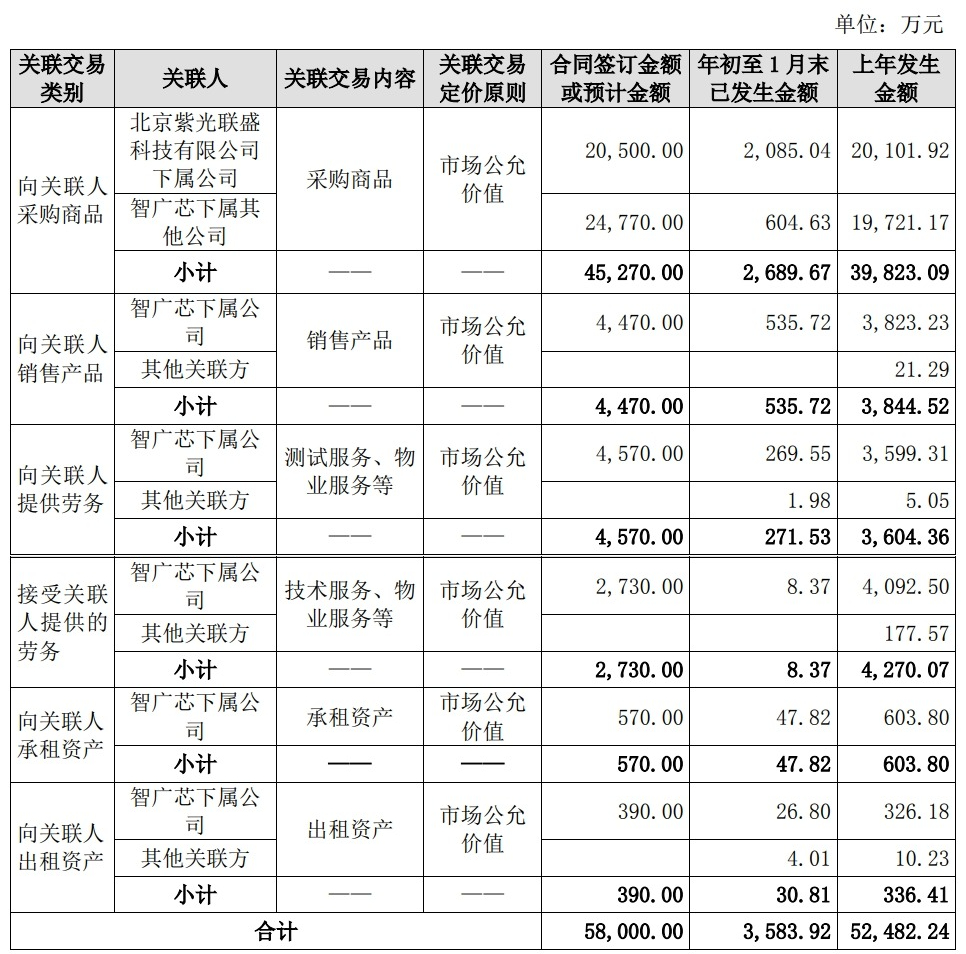 3月4日,紫光国微发布公告称,根据2025年度的生产经营和业务发展的需要,预计2025年度因向北京智广芯控股有限公司(以下简称“智广芯”)下属公司采购商品、销售产品、接受劳务、提供劳务等累计发生的与日常生产经营有关的关联交易总金额为5.80亿元,去年发生同类关联交易总金额为5.25亿元(未经审计)。