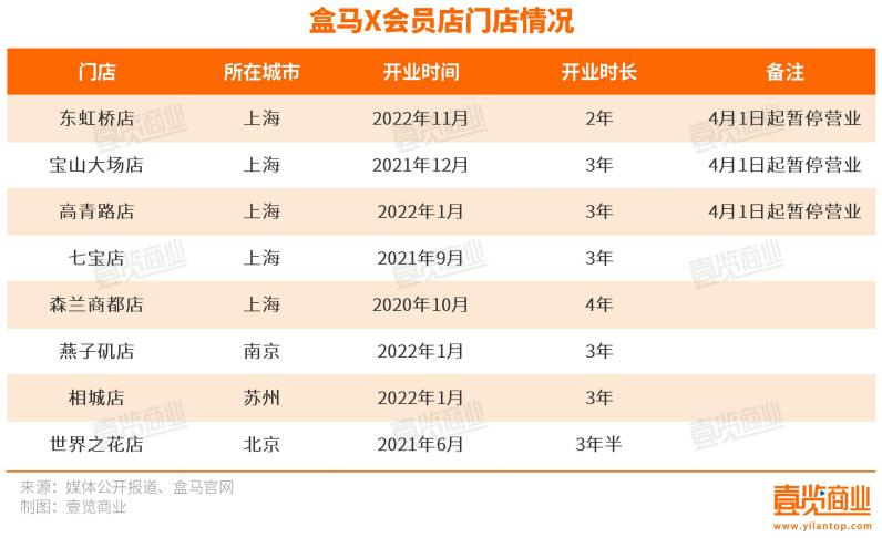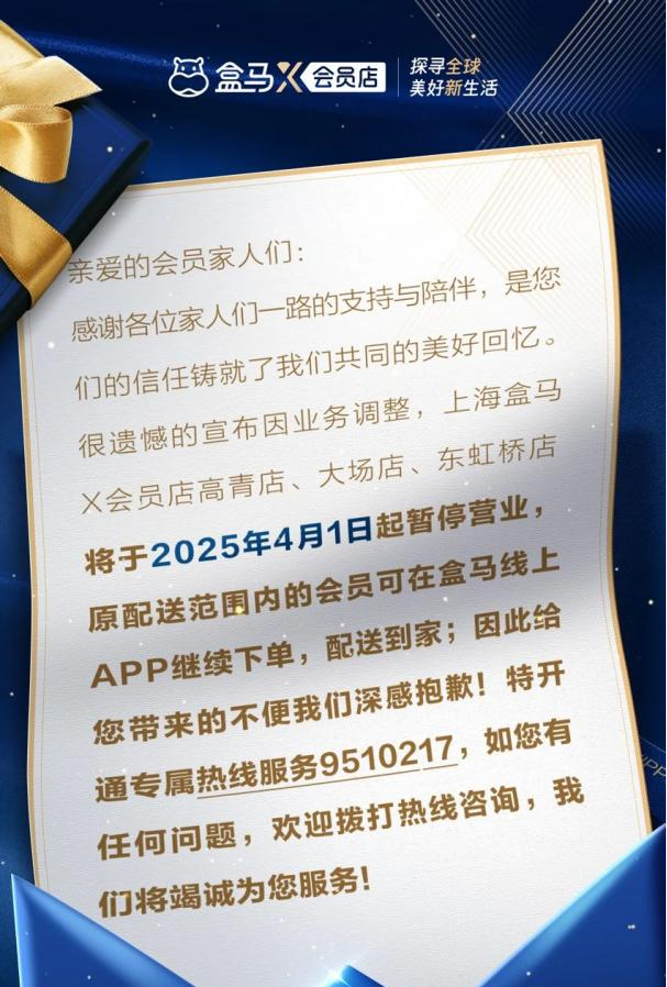 2月28日,盒马X会员店发布公告称,因业务调整,上海盒马X会员店高青店、大场店、东虹桥店将于2025年4月1日起暂停营业,公告显示,原配送范围内的会员可在盒马线上APP继续下单,配送到家。
