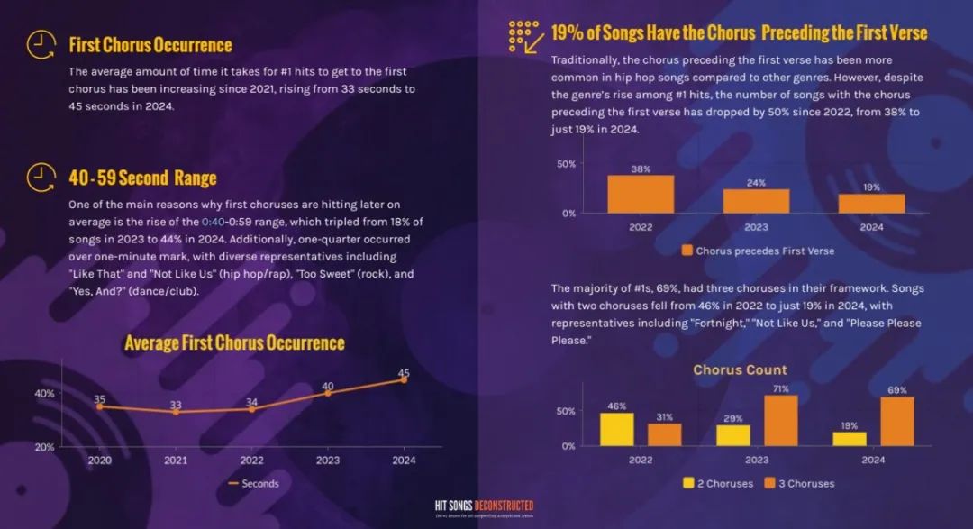 更引人注目的是,2024年约69%的大多数 No.1 歌曲都包含三个副歌,较2022年的仅31%,翻了两番多。相对而言,自2022年以来,只有两个副歌的No.1歌曲比例则从46%下降29%,再到今年的19%。