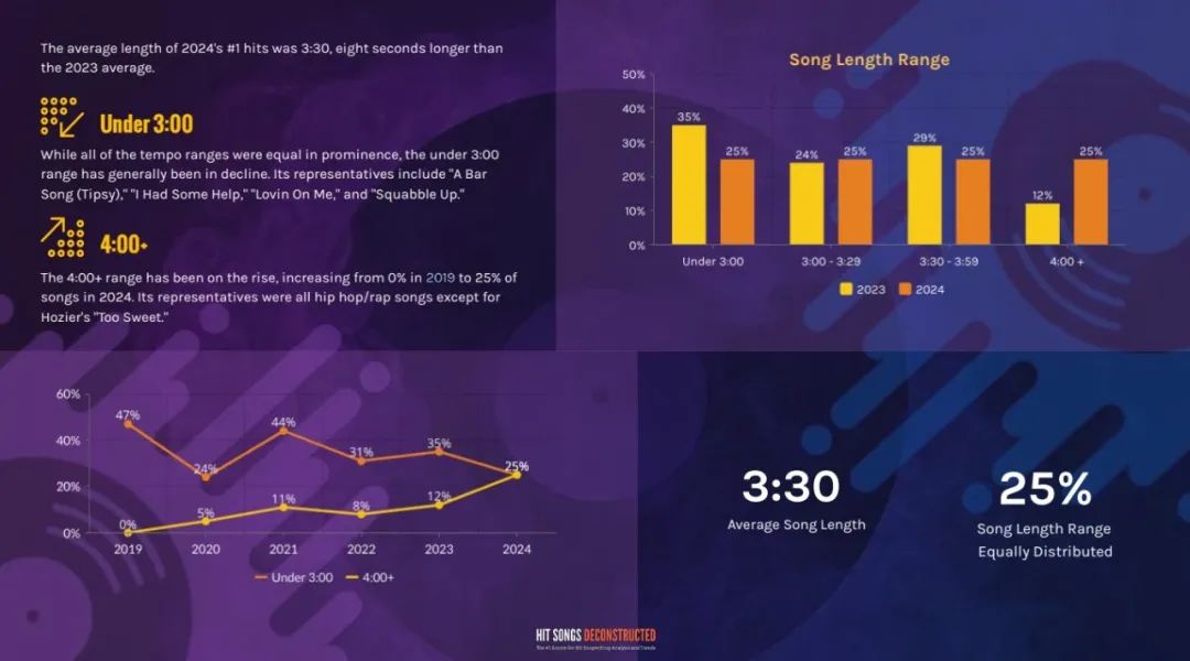 值得一提的是,2024年登上Hot 100榜单No.1的歌曲平均时长为3分30秒,较2023年长了8秒。而且,超过4分钟的歌曲数量也有了明显上升,从2019年的0%增长至2024年的25%。