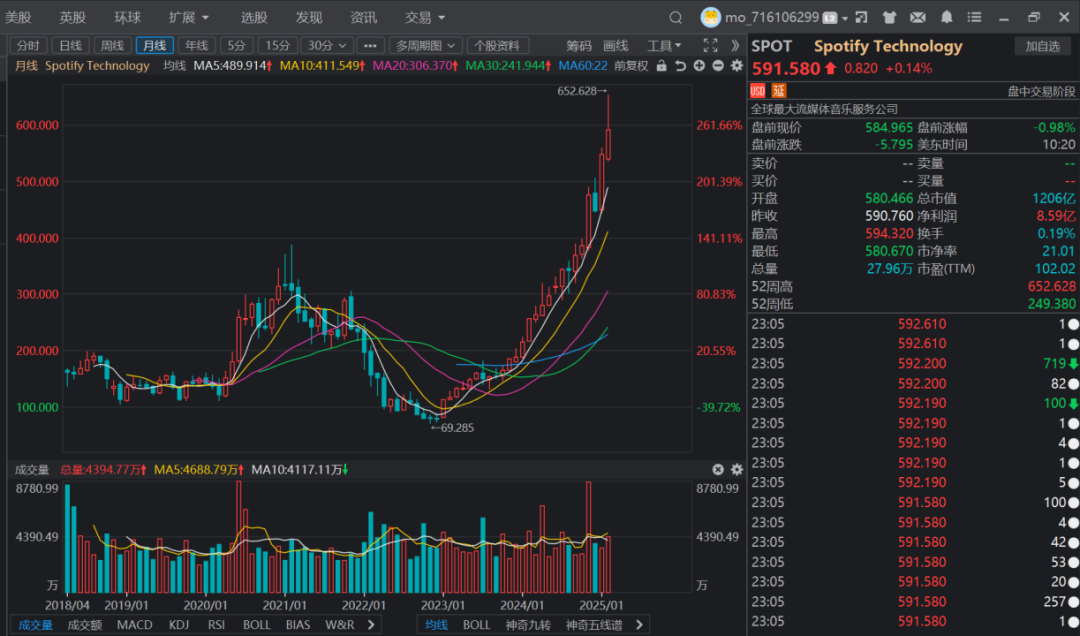 伴随着盈利转正,Spotify的股价也一飞冲天。2024年全年涨幅超138%,2025年短短两个月又上涨超30%。