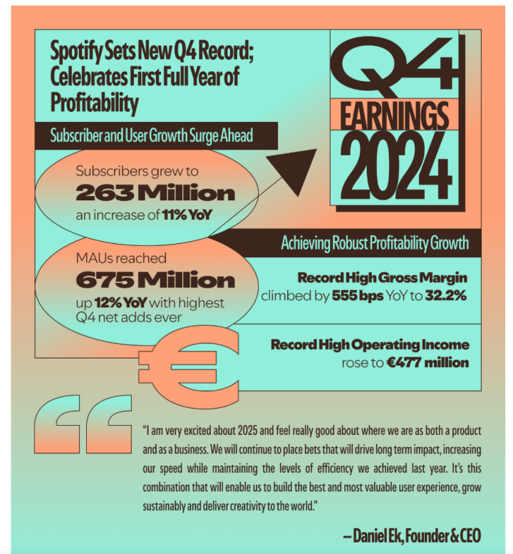 2024年,Spotify净利润达到11.38亿欧元(约88.2亿元人民币),全年营收达到156.73亿欧元(约1214.5亿元人民币),同比增长18.3%。