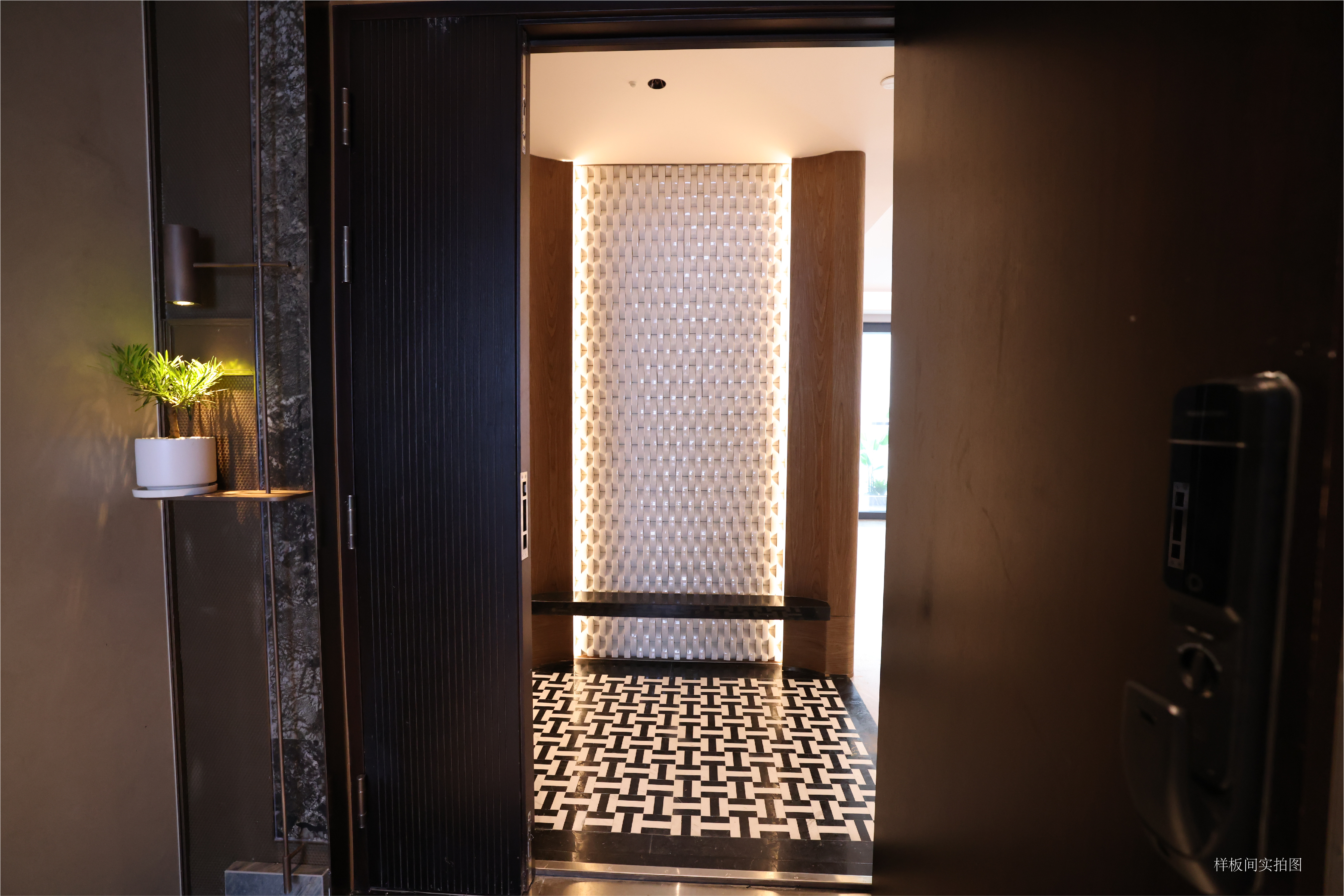 玄关映入眼帘的便是经典的海派风格搭配,以梵静黑与冰岛白为主色的天然石材再通过复杂的水刀切割工艺所形成 的拼花铺装,予人一种步入上世纪老洋房的唯美质感。玄关的陶瓷编织背景 墙,采用中国宋代五大名窑之首的汝窑出品的“汝瓷”,恰有一种“玉润冰清汝瓷韵,花开时节洒青灵”的高雅韵味,冰裂纹质感在灯光的映射下流光四溢,让归家也成为一种礼遇。