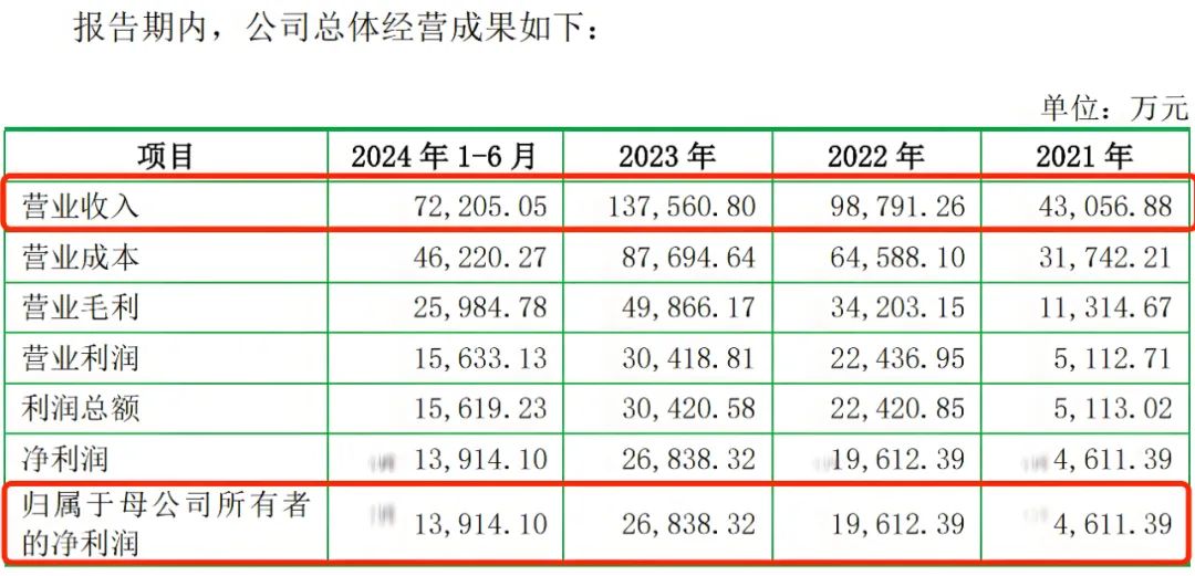 招股书显示,2021至2024年上半年(以下简称“报告期”),优优绿能的营业收入分别为4.31亿元、9.88亿元、13.76亿元和7.22亿元;归母净利润分别为4611.39万元、1.96亿元、2.68亿元和1.39亿元。