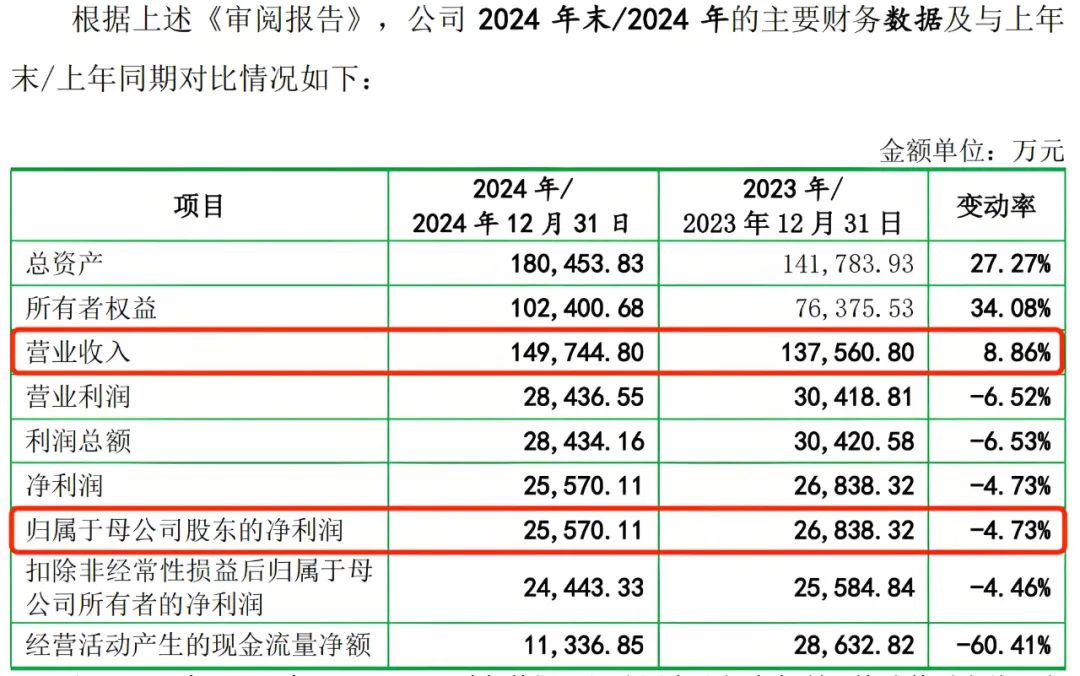 但这种高速增长没有维持太久。2024年审阅报告显示,公司营业收入14.97亿元,同比增长8.86%;归母净利润2.56亿元,同比下降4.73%,出现了“增收不增利”的情况。
