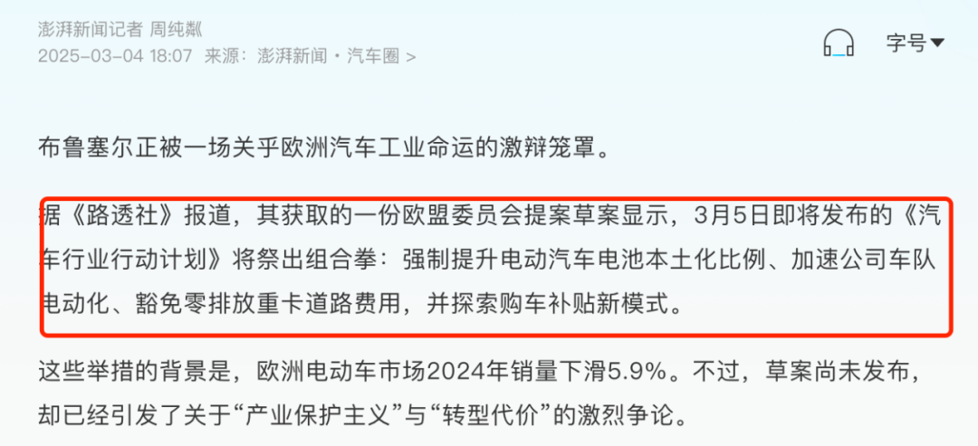 澎湃新闻报道,路透社获取的一份欧盟委员会提案草案显示,3月5日即将发布的《汽车行业行动计划》将祭出组合拳:强制提升电动汽车电池本土化比例、加速公司车队电动化、豁免零排放重卡道路费用,并探索购车补贴新模式。