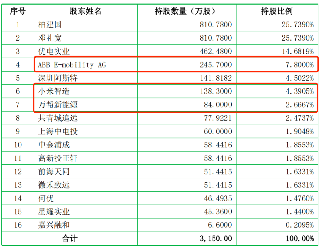 在递表前夕,小米也入股了优优绿能。2022年6月,公司进行了第七次增资,小米智造按照投前估值25亿元,以1.15亿元认购138.30万元注册资本,交易价格为83.33元/股,持股比例达到4.39%,投后估值约26.2亿元。