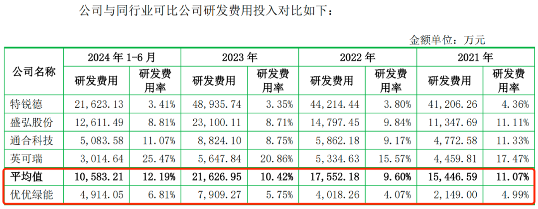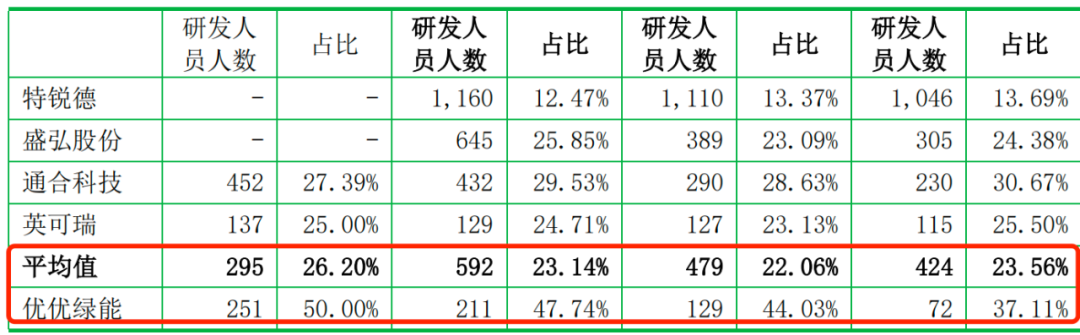 在研发人员上,报告期内优优绿能的研发人员分别为72人、129人、211人和251人,低于同行可比公司均值的424人、479人、592人和295人。