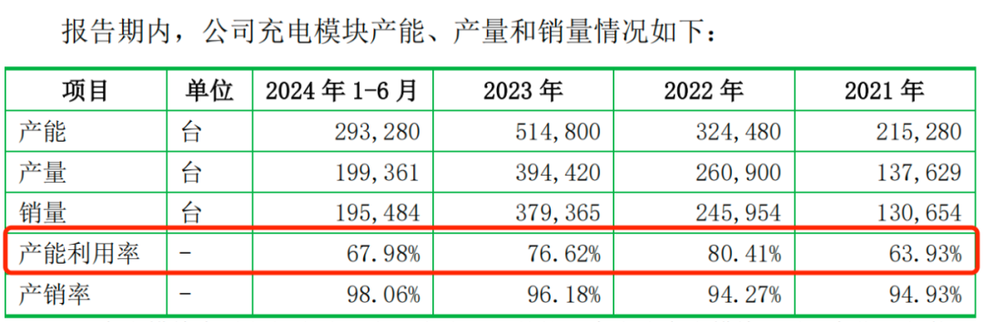 然而,优优绿能的充电模块目前正面临产能过剩风险。报告期内,公司充电模块的产能逐年提高,但产能利用率分别为63.93%、80.41%、76.62%和67.98%。2023年和2024年上半年,公司产能利用率持续下降。