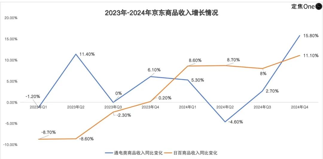 与通电类商品的大盘相比,京东日百品类2024年增速更快,全年收入增速达到9.2%。