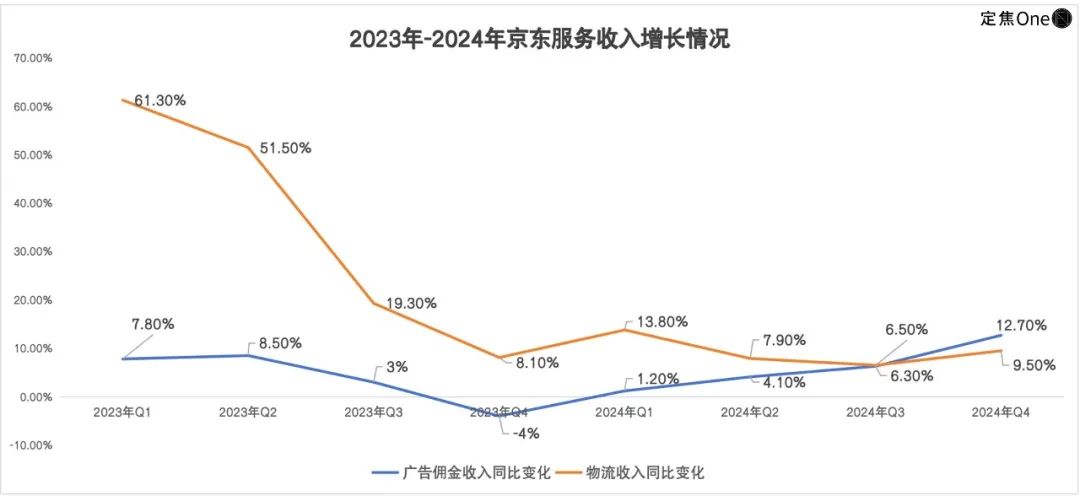 在京东的服务收入中,平台广告佣金(平台及广告服务)2024年收入为901.11亿元,增速达6.4%;物流收入为1407.01亿元,增速达9.3%。
