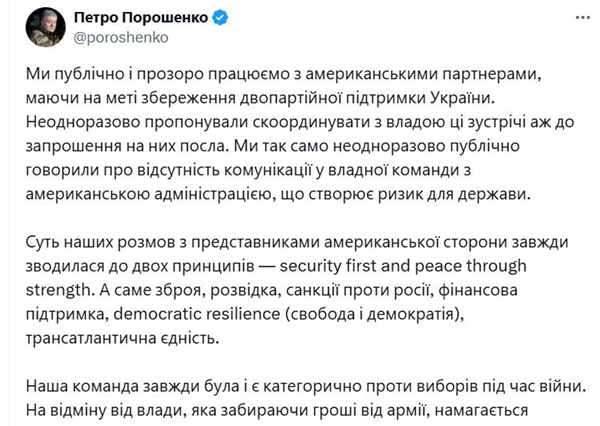 波罗申科发文证实,他的团队与“美国伙伴展开了公开、透明”的沟通,目的是确保美国两党对乌克兰的支持。他表示,与美方代表谈话的内容主要围绕两个原则:首先获得安全然后“通过力量”实现和平,包括对俄罗斯制裁以及美国提供武器、情报、经济支持。