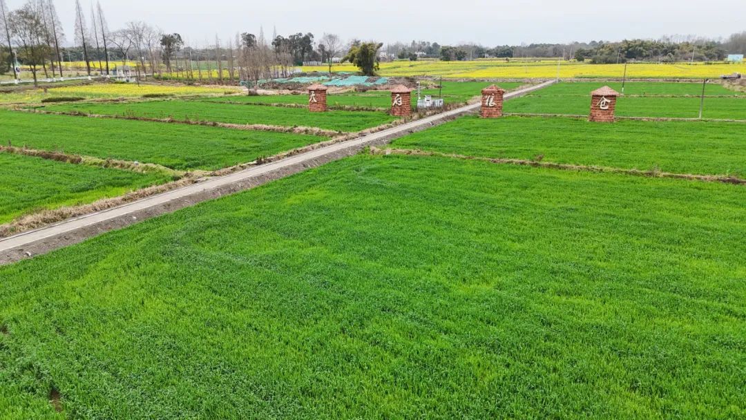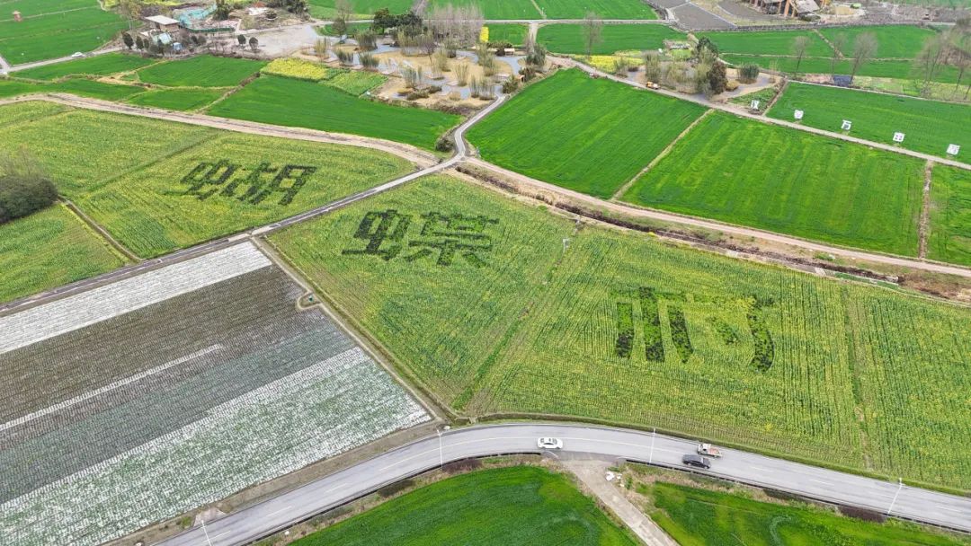 一半是翠绿的蒜苗,一半是金黄的花海,绿黄交融的乡野画卷与地景艺术装置相互辉映,像是漫画中走出的“麦田守望者”。
