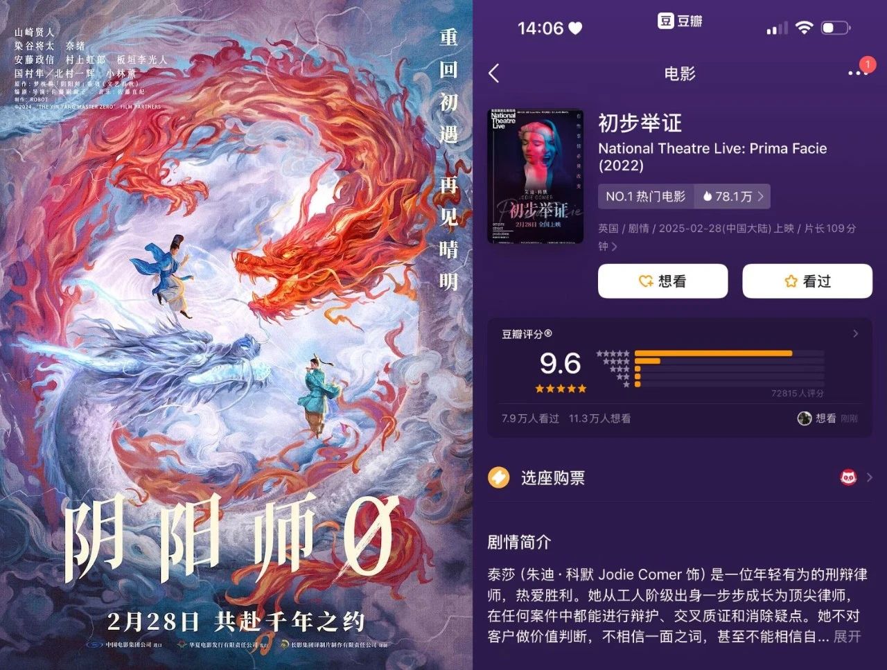 动画电影《猫猫的奇幻漂流》和《你的颜色》均未出圈,票房在千万级别停滞,而日本电影《阴阳师0》更是水土不服,仅收入200万+。值得一提的是,2022年的剧院电影《初步举证》上映5天后票房突破千万,已经超出了预期,该片豆瓣评分高达9.6分,是一部朱迪·科默的独角独幕剧。