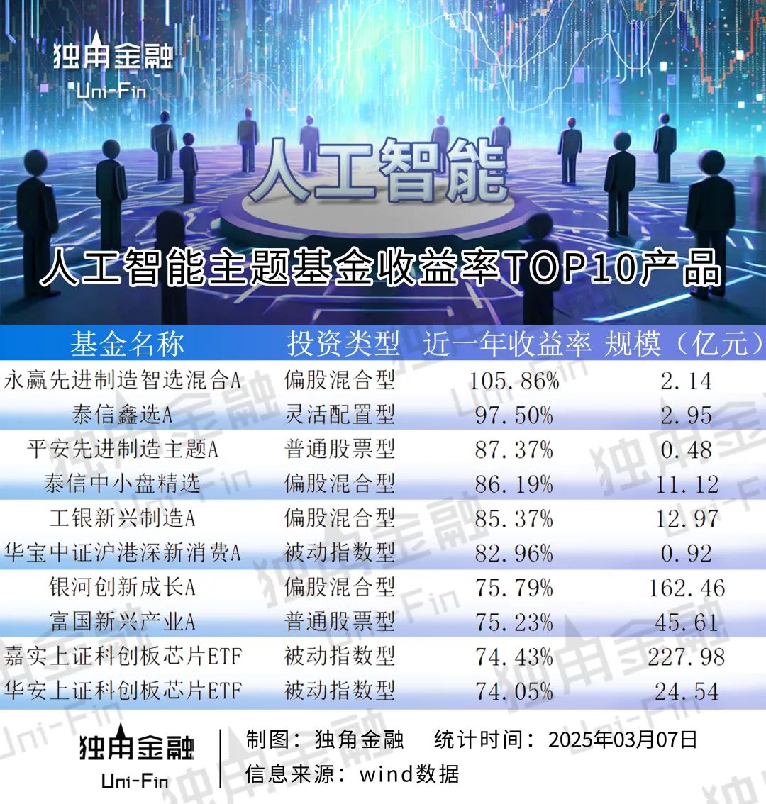查看wind数据,截至2025年3月6日,重仓人工智能概念的基金总计360只,独角金融统计收益率TOP10 产品发现,该类型基金近一年收益率均超过70%,涉及的公募包括永赢基金、泰信基金、平安基金、工银瑞信基金、华宝基金、银河基金、富国基金、嘉实基金、华安基金。