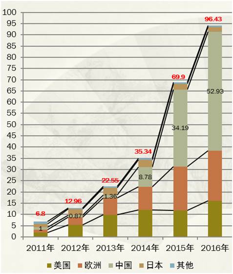 从2011年至2016年,全球电动汽车市场高速发展,年复合增长率接近70%; 其中,中国市场发展最快,2016年市场占比超过50%。