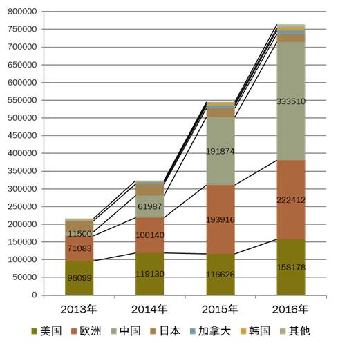 全球电动乘用车这一领域表现亮眼,年均复合增长率达52.36%;其中,中国市场在全球占比提升迅速:从2013年的仅占5.32%,到2014年的19.14%,到2015年的将近翻倍至35.19%,在2016年已占据全球43.62%的份额。