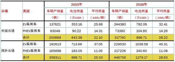 在EV乘用车领域,主要受补贴政策由“双80”调整到“双100”的影响,2016年中国市场单位车辆平均用量增加到32.41kWh/辆,增长26.31%;而海外市场单位车辆平均用量增加到45.31kWh/辆,高出中国市场较多,主要原因是电池能量密度较高的特斯拉的销量很大。在PHEV乘用车领域,中国市场单位车辆平均用量略有下降,主要原因是补贴退坡,车企在允许范围内尽可能少用电池以降低成本;而海外市场单位车辆平均用量略有增长,主要是消费者希望延长纯电续航里程这一市场因素驱动。