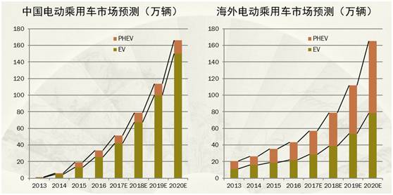 根据中国政府2020年产销量200万辆的目标规划来预测,中国EV乘用车2017年增速预计65%,此后3年每年增速在50%以上,保持高速发展态势;PHEV乘用车预计每年增速20%。根据海外市场过往发展情况及主要企业规划综合预测,海外EV乘用车2017年增速预计30%,此后3年每年增速增加5%,PHEV乘用车2017年预计增速35%,此后3年每年增速增加5%。