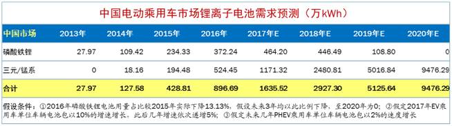 乘用车市场的蓬勃发展,推动乘用车市场锂电需求快速增长,预计到2020年,中国乘用车市场的锂电需求将达到9470万kWh,较之2016年增长约十倍。其中,磷酸铁锂的需求量在2017年后逐年减少,至2020年或将退出锂电市场,但三元/锰系电池在2017年后保持连年翻番的速度增长,成为乘用车锂电主流。