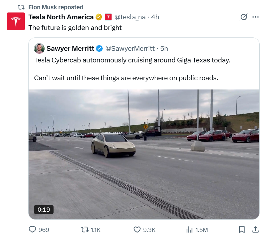 特斯拉CEO埃隆·马斯克3月9日在社交平台X上转发了一条关于特斯拉无人驾驶出租车(Cybercab)的贴文,贴文称:“特斯拉Cybercab今天在得克萨斯超级工厂附近自动驾驶巡游。真等不及这些车遍布公共道路的那一天了。”视频中是一辆金色的特斯拉Cybercab,据该博主介绍,这是一辆双座车。