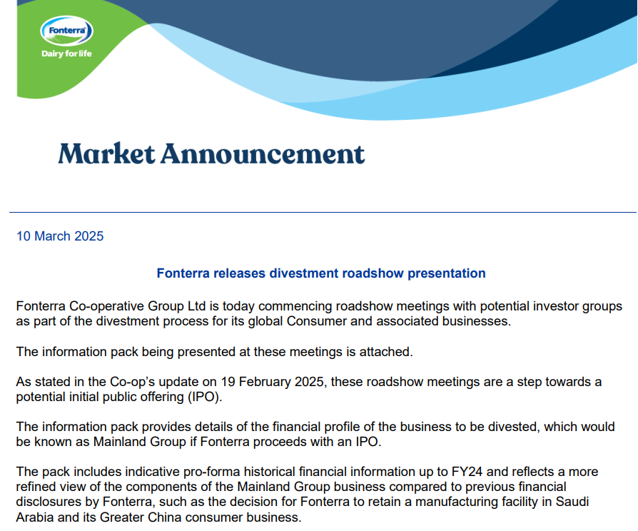 恒天然集团当地时间3月10日在新西兰证券交易所提交文件称,作为剥离全球消费品及相关业务计划的一部分,今日开始与潜在投资者团体举行路演会议。路演会议将在新西兰、澳大利亚和亚洲举行。