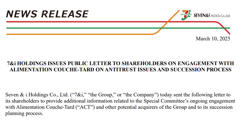 公开信称,“直到最近”,ACT的立场一直是柒和伊控股应先签署ACT提出的收购协议,然后要么分拆重叠门店,要么在签署最终协议后尝试寻找剥离买家,“这将给柒和伊控股带来不可接受的风险负担”。