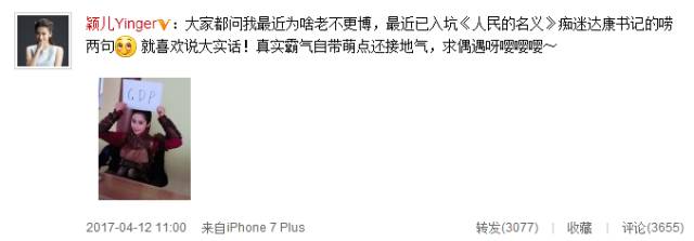 4月12日,演员颖儿在微博中写道“大家都问我最近为啥老不更博,最近已入坑《人民的名义》痴迷达康书记的唠两句,就喜欢说大实话!真实霸气自带萌点还接地气,求偶遇呀嘤嘤嘤~”。