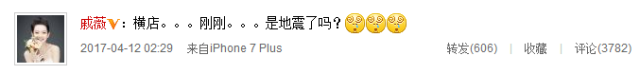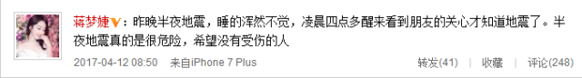 4月12日凌晨杭州突发4.2级地震,浙江其他地区亦有震感,横店也不例外。凌晨2时许,戚薇发微博称:“横店。。。。。刚刚。。。。。是地震了吗?”看来是感受到了震感。随后沈梦辰也在戚薇微博下留言称睡觉时被惊醒,床与窗户都动了一下,引来网友的关注,纷纷留言安慰。12日上午,蒋梦婕亦发微博向粉丝与网友们报平安~