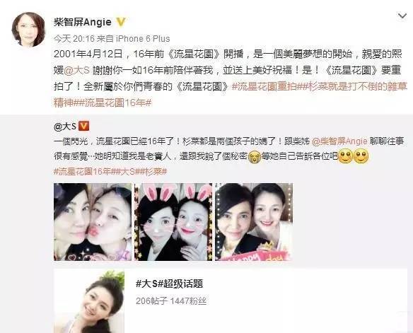 昨晚,大S晒出与柴智屏的合影并感慨自己曾在《流星花园》中饰演女主角杉菜已经16年,如今已是2个孩子的妈了,接着又丢了一个包袱让柴智屏来爆料。随后,柴智屏转发大S微博,自曝《流星花园》要翻拍了!