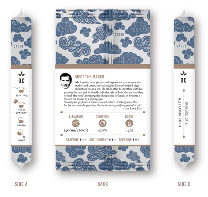如果你熟悉精品咖啡,一定记得它在包装上注明的各种风味,在 Dachi Tea 这里,从各地采摘的乌龙茶会因为光照水源等问题产生不同的风味,而它在用图像把这些风味表现出来时,就显得直观好理解了。