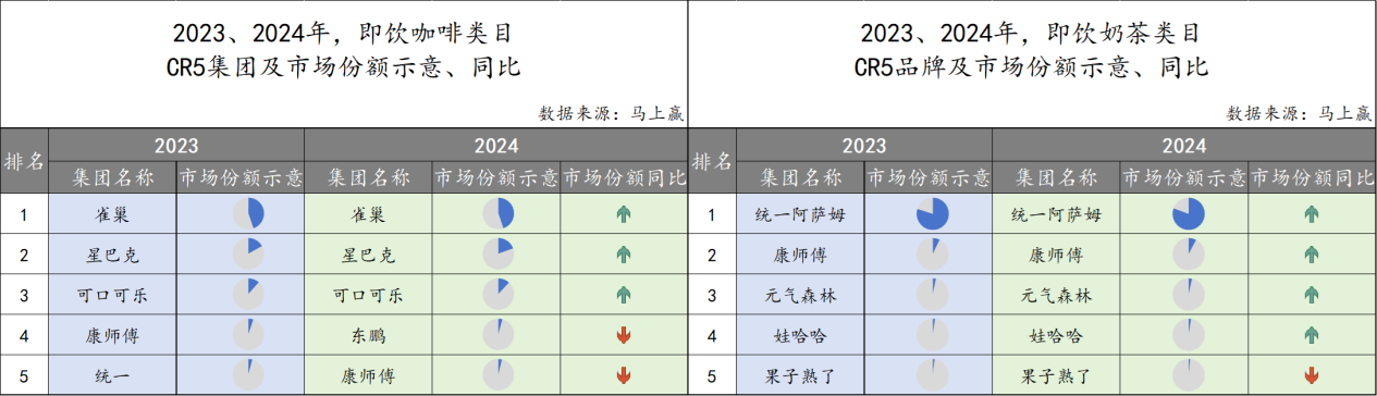 基于马上赢品牌CT的数据,即饮奶茶类目CR5品牌的市场份额从2023年的94.83%上升到2024年的95.91%;而即饮咖啡CR5品牌的市场份额则从84.32%上升到85.35%。