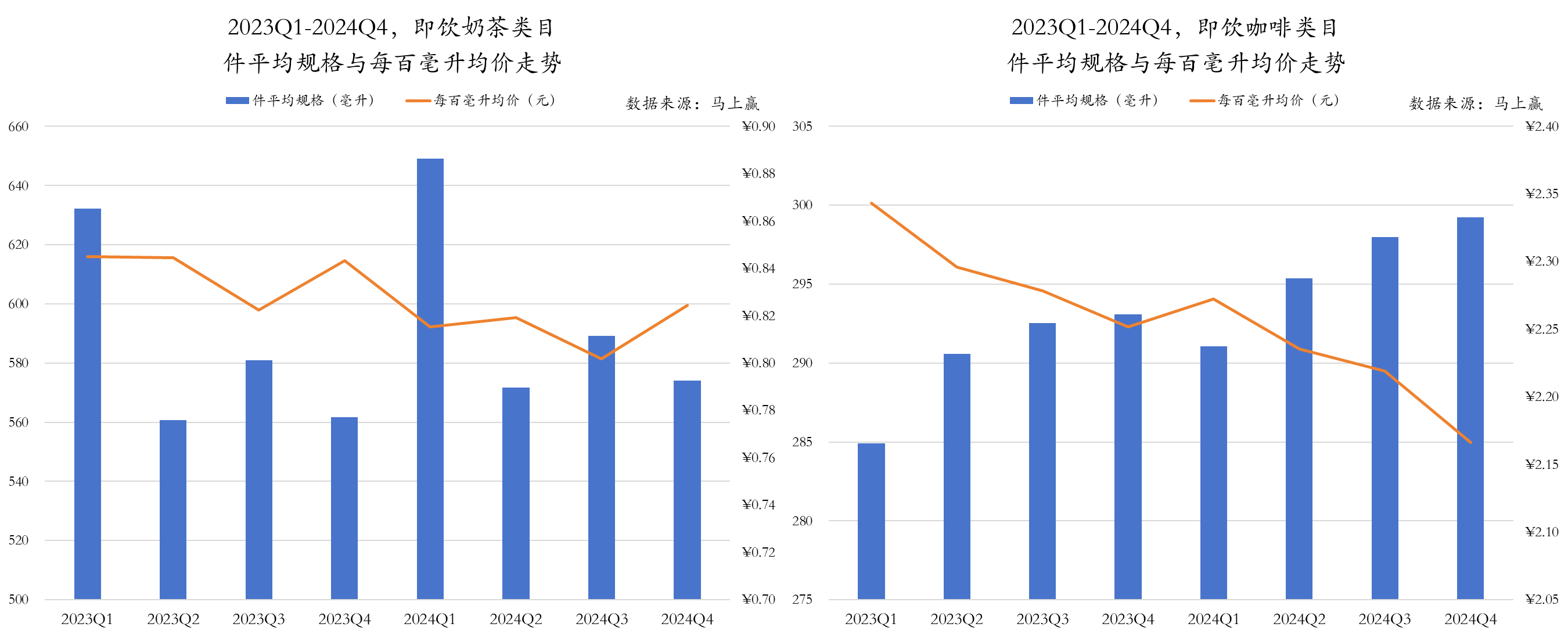 综合考察平均规格与每百毫升均价的变化,二者也呈现出类似的变化趋势。即饮奶茶的每百毫升均价整体呈缓慢下降趋势,而即饮咖啡的每百毫升均价则明显下滑,降幅接近10%。与此同时,两者的平均规格均有所上升,这或许与饮料市场整体向大包装化发展的趋势相吻合。