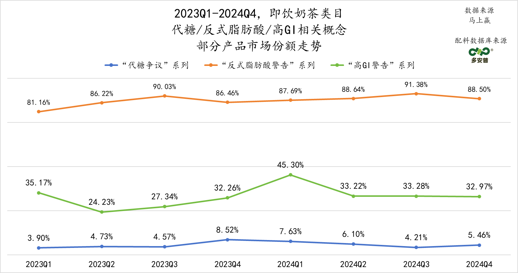 - 含有“高GI警告”系列原料的产品市场份额在25%~45%之间波动,且呈现出一定的上升趋势;