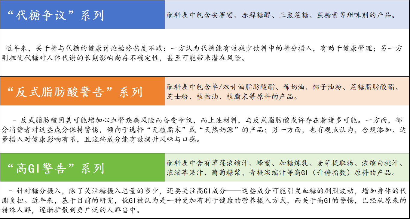 - 与此同时,涉及“代糖争议”系列原料的产品市场占比虽然低于10%,但增长较为明显——这可能也与即饮咖啡本身的口感特性有关,代糖更容易在咖啡的风味体系中应用,而不会显著影响产品的口感体验;