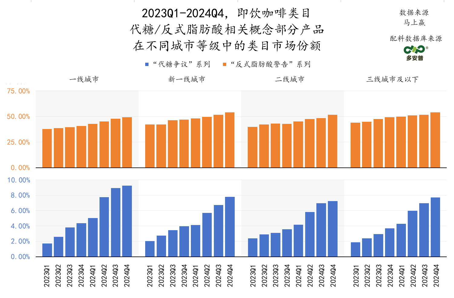- 含有“反式脂肪酸警告”系列原料的产品,在各级市场均呈现上升趋势,且在低线城市的占比略高于一线城市。这可能与奶咖类产品市场份额的提升有关——作为更具饮料化特性的入门级咖啡饮品,奶咖在咖啡市场普及的背景下增长迅速,可能是含有“反式脂肪酸警告”系列原料的产品市场份额增加的主要原因。
