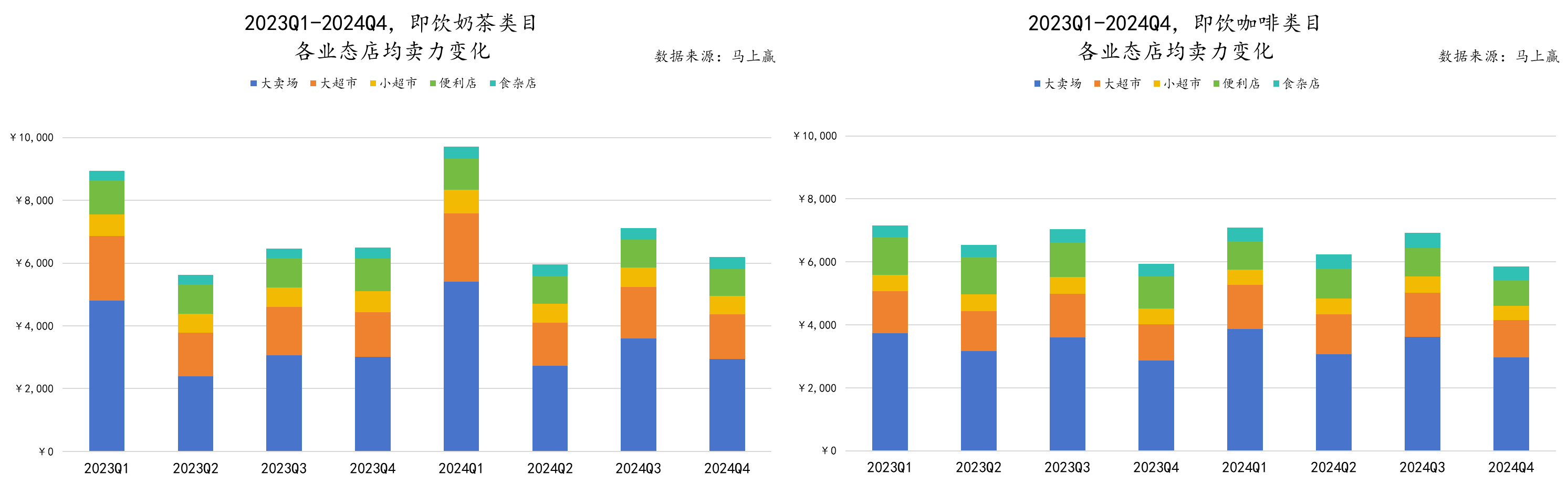 基于马上赢品牌CT中的数据,2023、2024年,即饮咖啡/即饮奶茶在各业态渠道的市场份额整体呈现下降,其中大卖场、大超市的即饮产品市场份额降幅相对较小,或表明即饮产品在这些渠道中,受现制饮品影响较小。