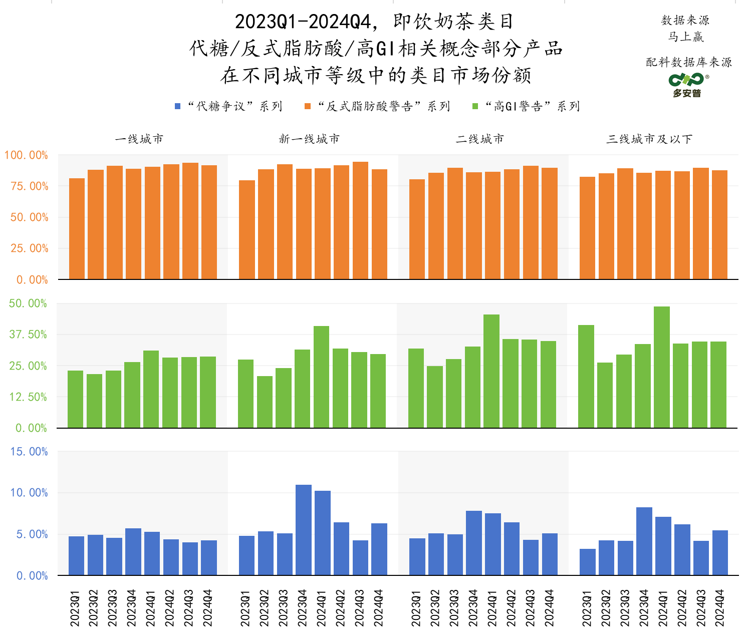 - 含有“代糖争议”系列原料的产品在所有城市等级中均处于低位,且在一线城市的占比反而最低;
