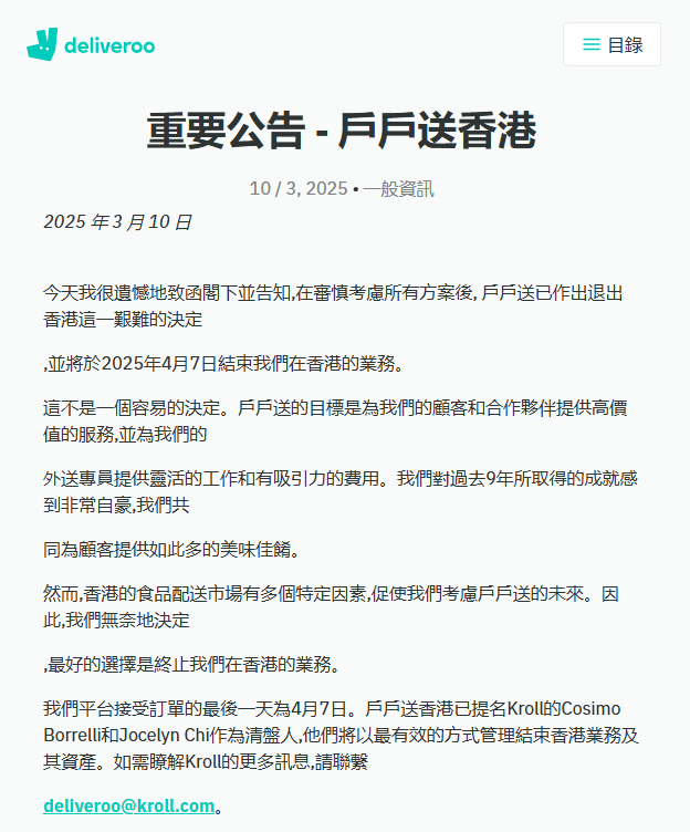 户户送(Deliveroo)3月10日宣布,将于2025年4月7日结束在香港的营运。作为过渡阶段的一部分,户户送会与foodpanda合作继续为本地的顾客、餐厅伙伴及外送专员服务。户户送称,户户送香港已提名德安华(Kroll)的Cosimo Borrelli和Jocelyn Chi作为清盘人管理结束香港业务及其资产。