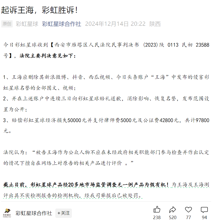 去年12月中旬,彩虹星球(含日化业务)发布推文称,王海及王海测评使用不实检测报告,擅自发布大量视频诋毁彩虹星球产品为假有机。故该品牌对王海提起诉讼,法院认定王海的行为构成名誉侵权,彩虹星球胜诉且获赔近10万元。