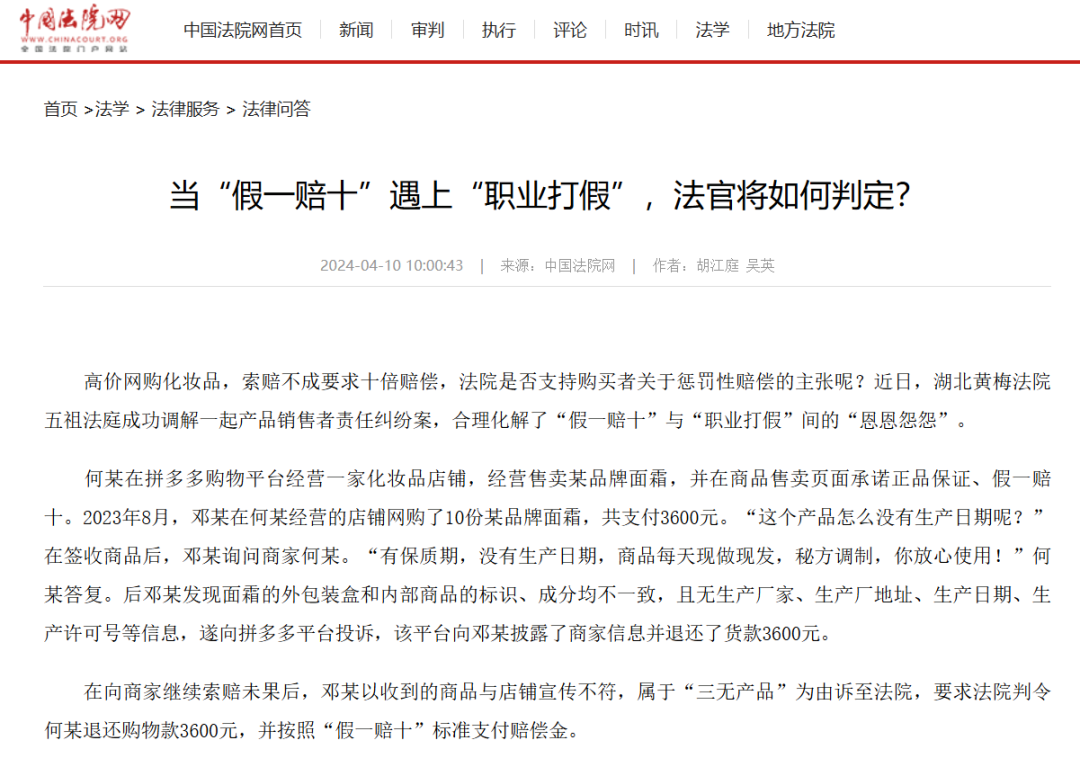 去年4月,中国法院网披露一起,在拼多多高价购买某品牌面霜,并索赔十倍赔偿的案例。最后法院认定,原告邓某(索赔人)一次性购买10瓶面霜行为超出正常消费范畴。