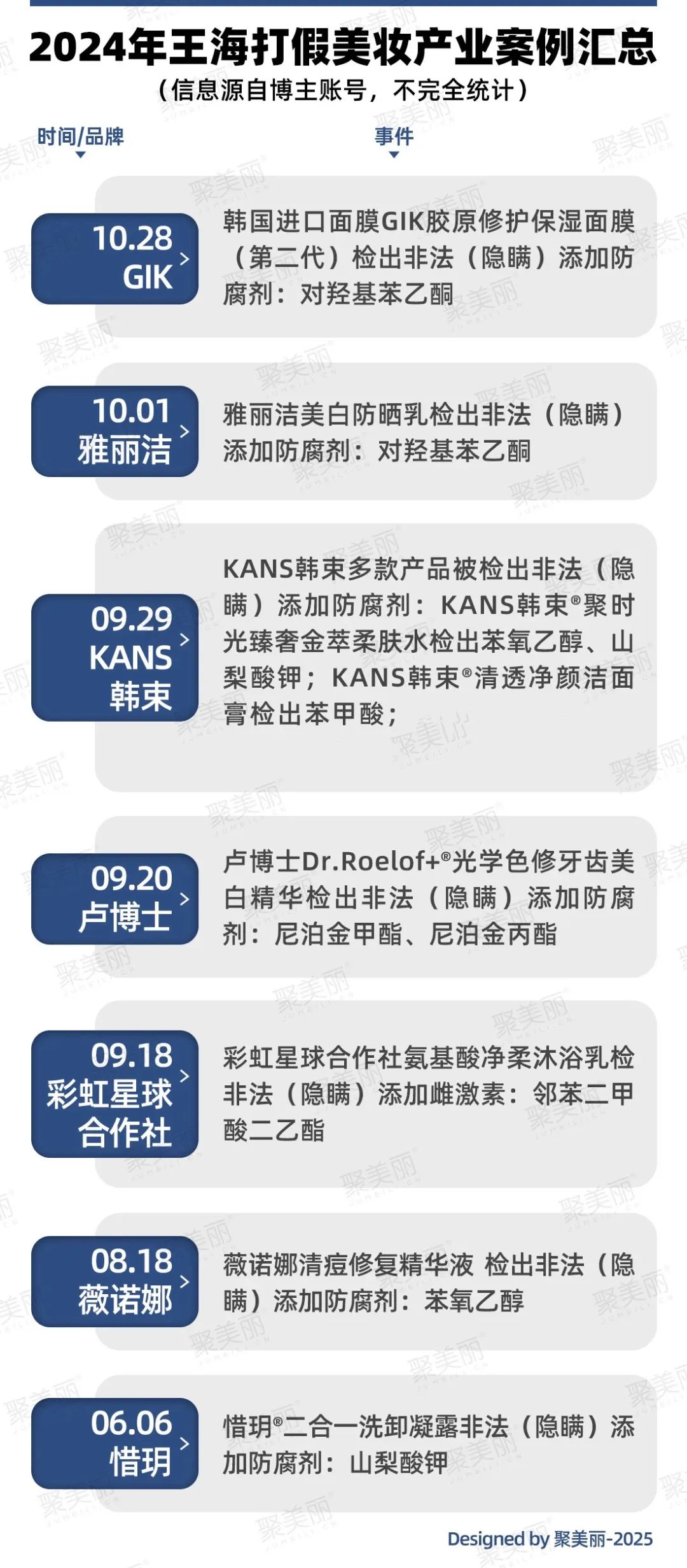 其中,以老熟人王海最为突出。据聚美丽不完全统计,去年7个美妆品牌被其直指,检出非法(隐瞒)添加防腐剂,包括GIK、韩束、薇诺娜等。