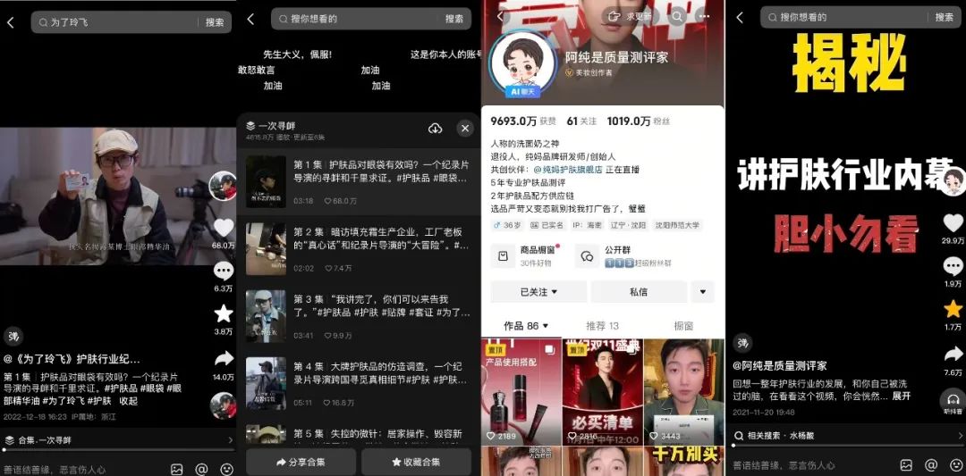 同样的还有为了玲飞,2022-2023年因一系列揭露化妆品行业内幕视频,在短短数月获得了一大波粉丝和支持,其早期视频点赞量均高达几十万。