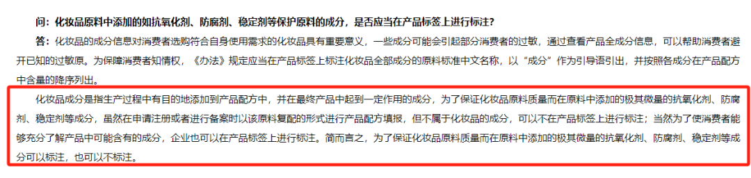 该被质疑的产品从法规的角度来看,也存在不攻自破的矛盾:2022年国家药监局发布《化妆品监督管理常见问题解答(五)》中规定,为保证化妆品原料质量而添加的极其微量的防腐剂等成分,可不标注在配方表中。