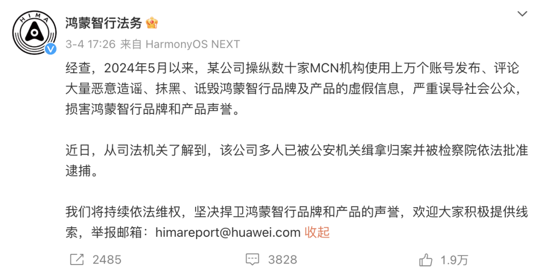 据鸿蒙智行发言人透露,开放线索和证据征集之后第二天,就收到了超过1万条私信。3月4日,认证为“鸿蒙智行法务官方微博”的鸿蒙智行法务发了第一条微博,公布了一起案件的进展: