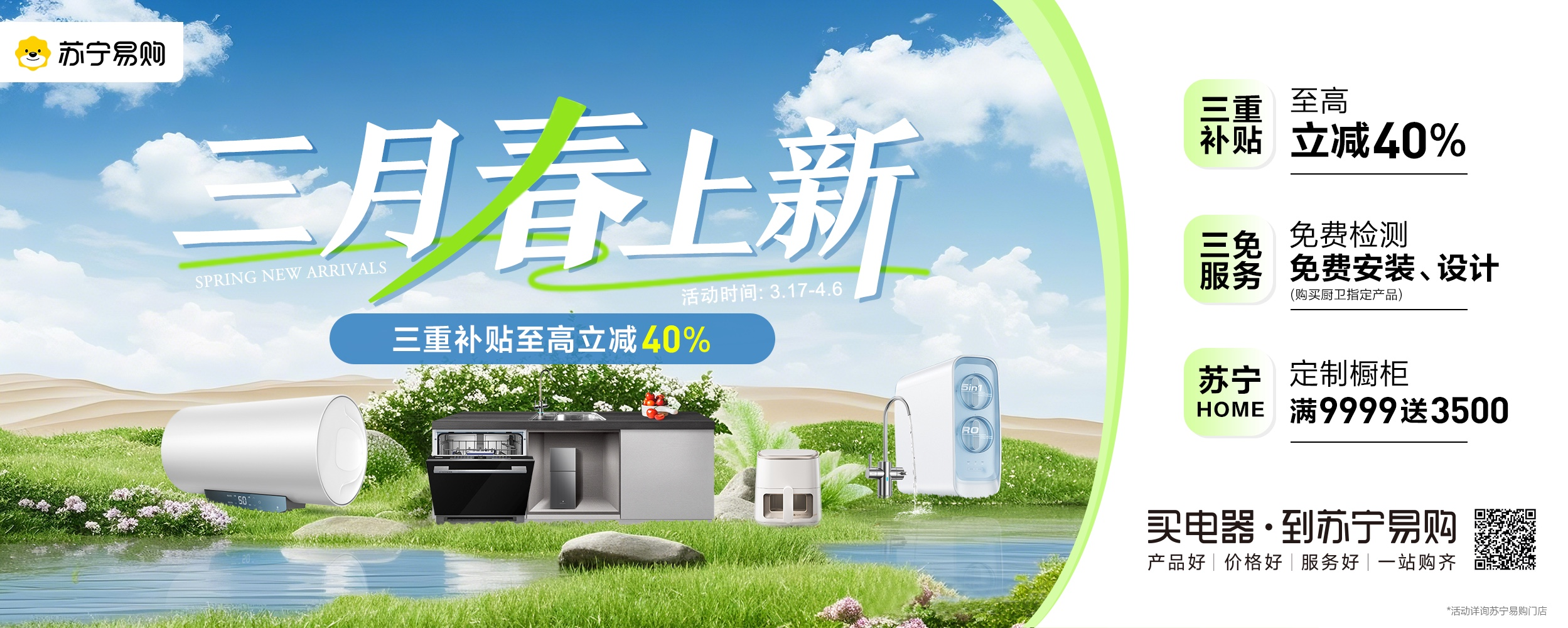 进入金三银四家装旺季,苏宁易购联合方太、老板、美的、博西等品牌启动“三月春上新”大促,持续助力以旧换新国补新政策,打造春季装修、厨卫换新最佳入手期。活动期间,苏宁易购将推出三重补贴至高立减40%,“免费检测、免费安装、免费设计”三免服务,苏宁Home定制橱柜满9999元送3500元等多重福利优惠。据悉,活动将持续至4月6日。