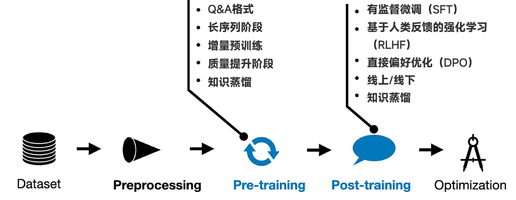 后训练过程通常包括微调、对齐和评估三个阶段。