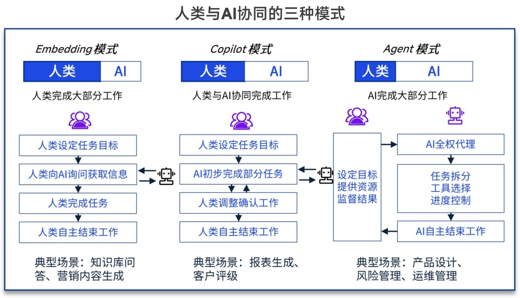 人类与AI交互大致可分为三种模式:嵌入模式(Embedding)、副驾驶模式(Copilot)、智能体模式(Agent)。