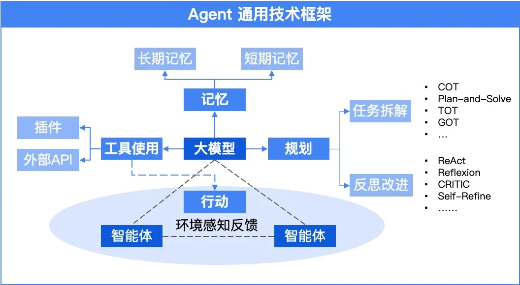 其中,大模型是Agent的大脑, 属于“中枢”模型,要求有以下3种能力:规划——就如同一位棋手,能将复杂局面分解为一系列精妙的子步骤;工具使用——宛如工匠,懂得从工具箱中选取最合适的工具并熟练调用 ;记忆——既有短期记忆存储即时信息,又有长期记忆沉淀持久知识 。